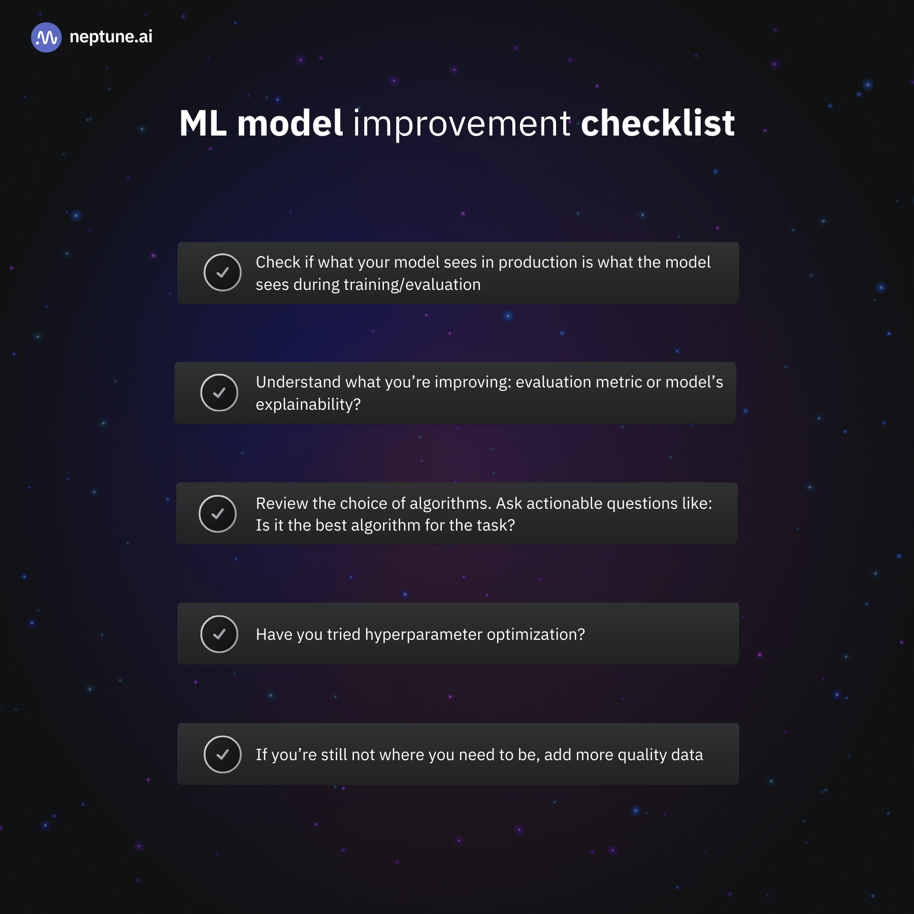 Once you’re clear on what you’re trying to improve, look at the models you’re using. Ask actionable questions like “Is it the best algorithm for the task?” For example, tree-based models like random forests or XGBoost work well if you care about explainability and want to trace back the roots of the prediction. - Have you tried hyperparameter optimization?