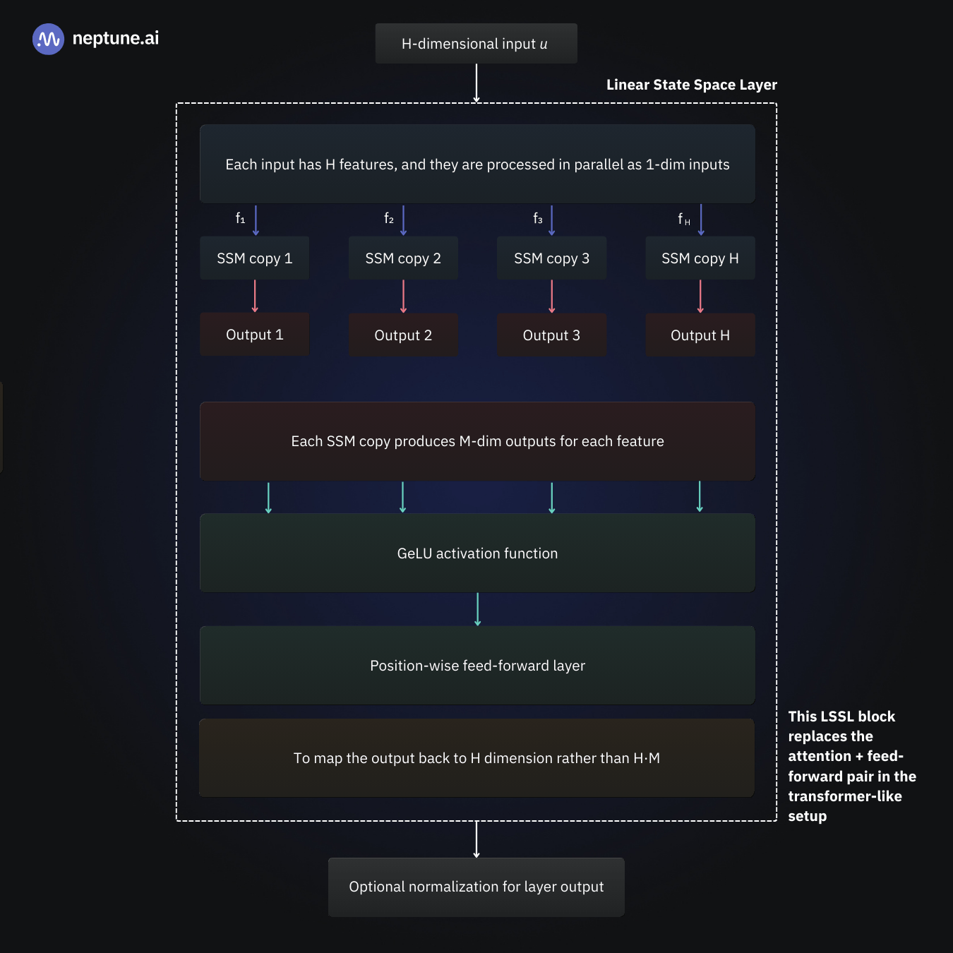 In their paper, Gu and collaborators describe the LSSL architecture as a “deep neural network that involves stacking LSSL layers connected with normalization layers and residual connections.” Similar to the attention layers in the transformer architecture, each LSSL layer is preceded by a normalization layer and followed by a GeLU activation function. Then, through a residual connection, the output is added to the normalized output of a position-wise feedforward layer.