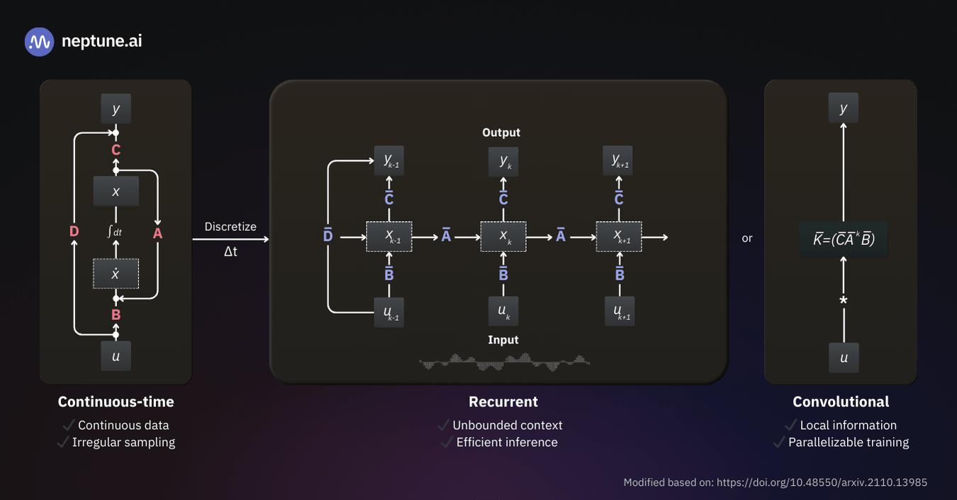 So far, we’ve seen that State Space Models are efficient sequence models. In their paper Combining Recurrent, Convolutional, and Continuous-time Models with Linear State-Space Layers, Gu and colleagues introduced the Linear State Space Layer (LSSL) utilizing both the discretized recurrent and convolutional forms of State Space Representation equations. This layer is integrated into deep learning architectures to introduce efficient handling of long-range dependencies and structured sequence representations.