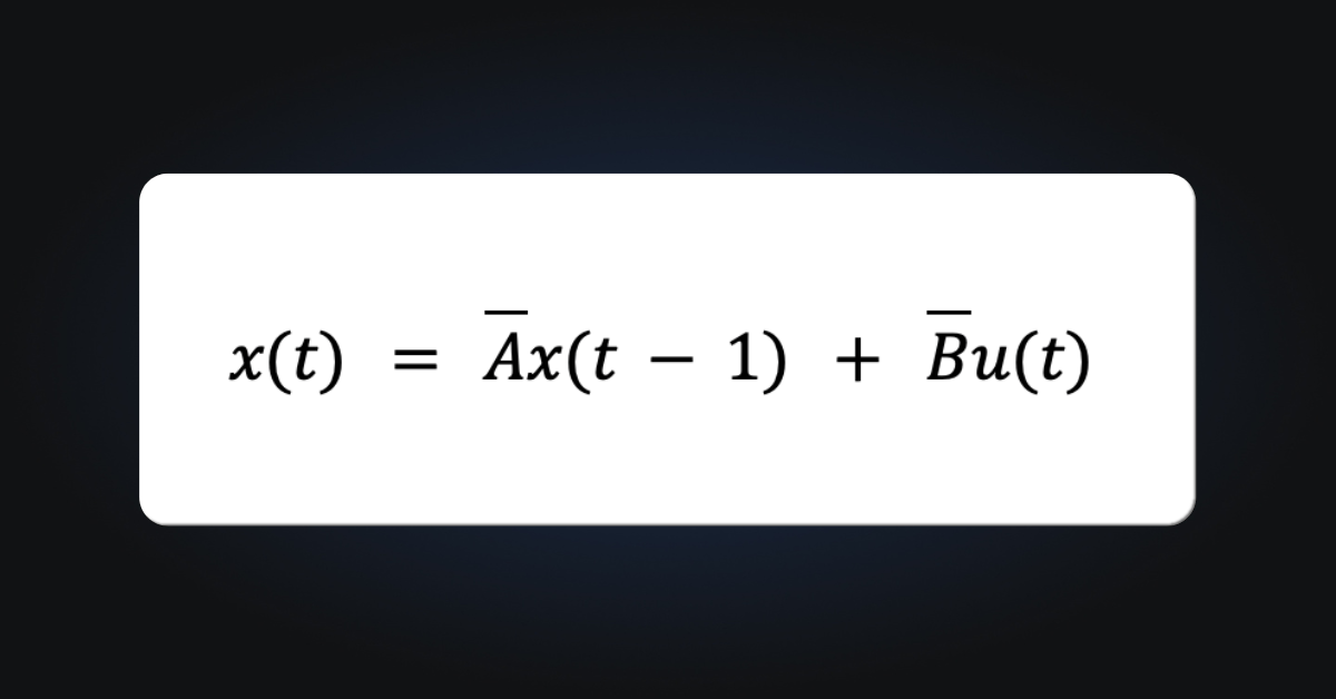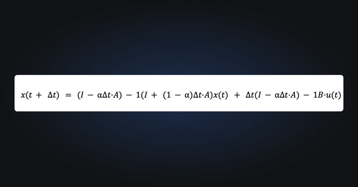 Here, x is the state representation, Δt is the time step, A is the matrix that represents how the state is influenced by the previous state, B is the matrix that represents the effect of the input on the current state, and I is the identity matrix which ensures that the output has consistent dimensionality.