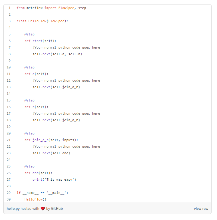 Just like ZenML, Metaflow also uses steps to decorate functions, so it can be quite similar to users with ZenML experience. However, it uses a structure that specifies the flow within the steps themselves, which may seem a little confusing. Also, in order to create a flow, you should first create a class (MyFlow, for example) that is going to contain its steps.