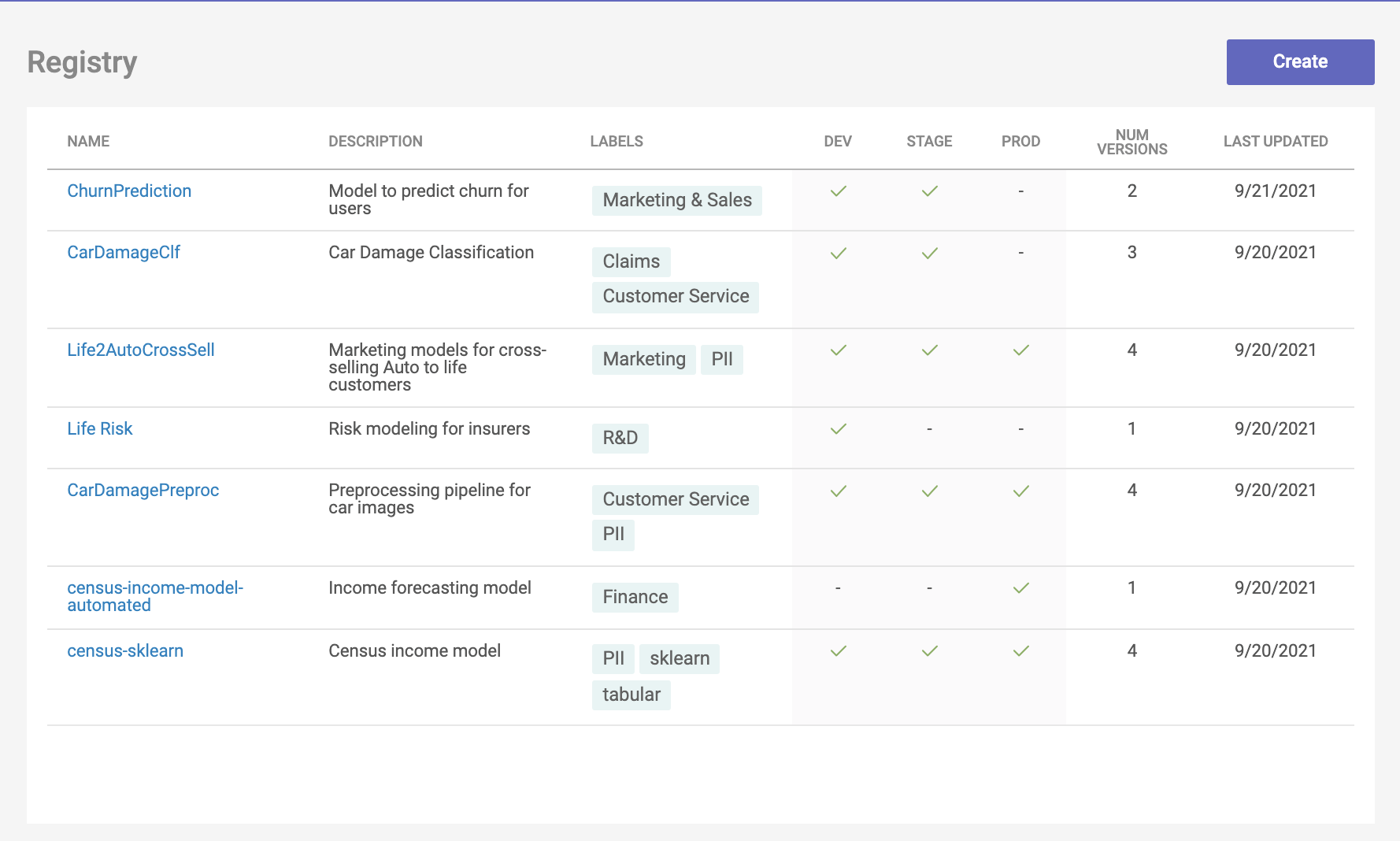 The entire purpose of a model registry tool is to provide an easy overview of all the versions of models that the development team has tried. While selecting the tool, you must remember that the tool must provide the model overview of each version at every stage. Tracking models extend beyond development; it is done for maintenance and enhancement in staging and production as well. The machine learning model lifetime including: